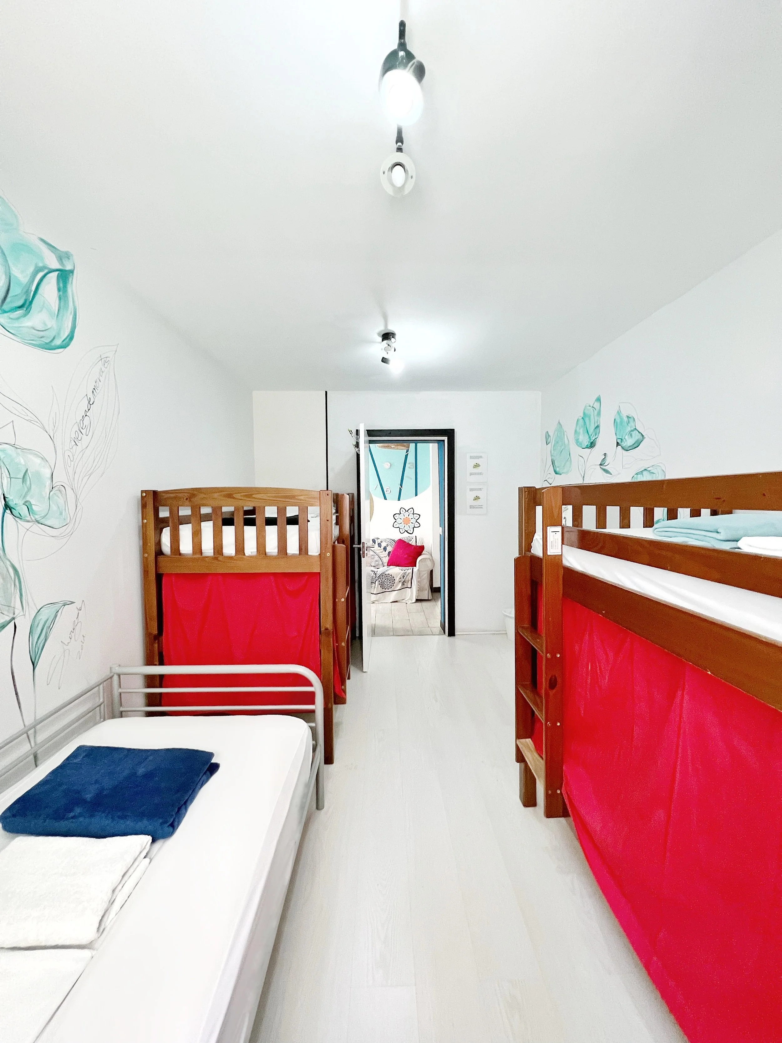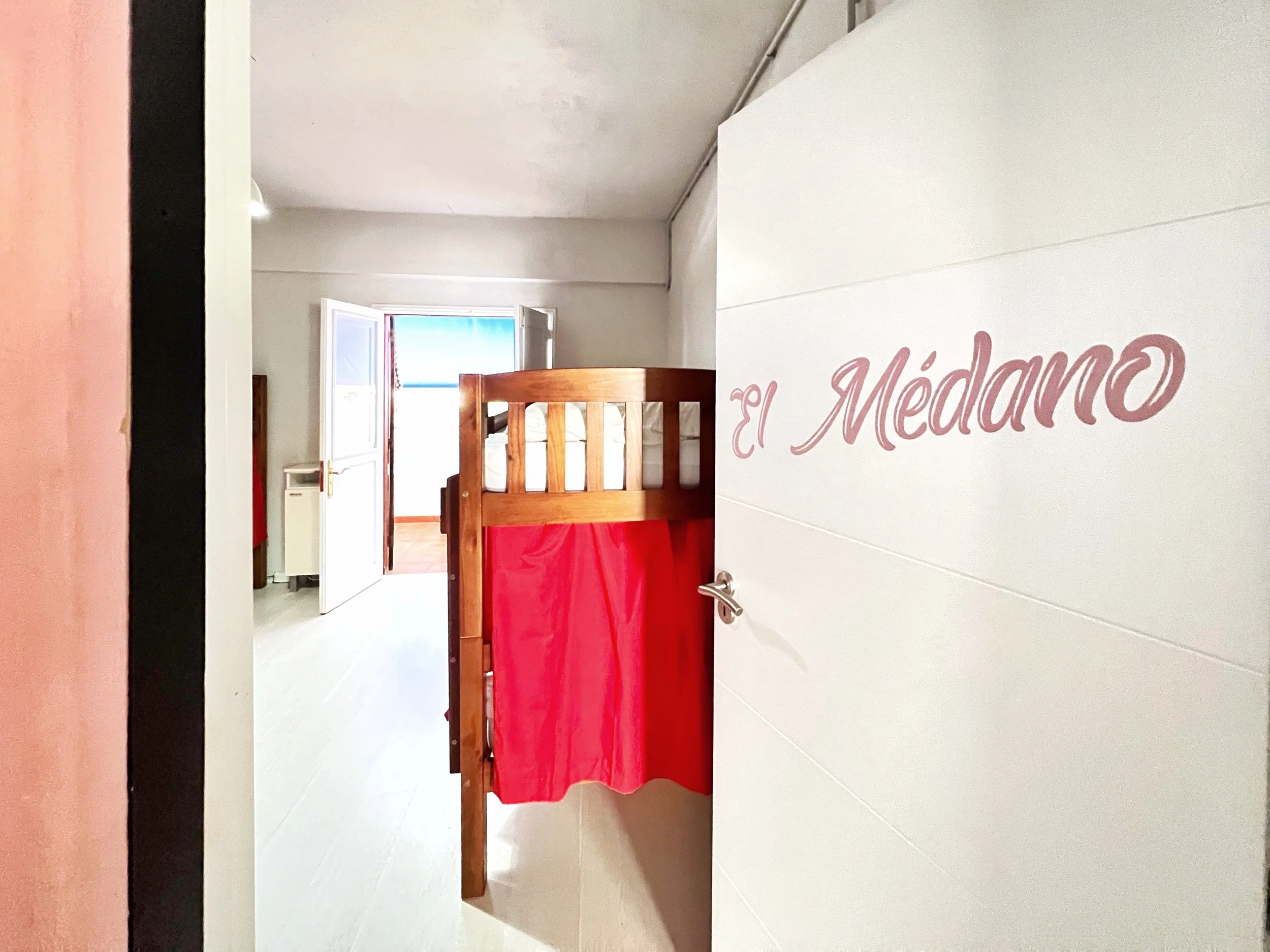 Habitaciones mixtas con capacidad para seis personas. Son dormitorios amplios y muy luminosos, en los que podrás conseguir un sueño reparador después de pasar todo el día explorando Tenerife. Cada dormitorio está equipado con tres cómodas literas y con taquillas para poder guardar tus cosas de forma segura. Puedes reservar camas individuales y compartir dormitorio con otros viajeros o reservar la habitación completa para utilizarla de forma privada.